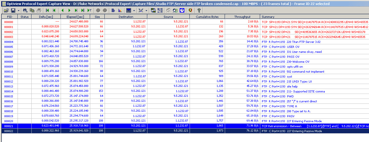 在这种情况下,FTP服务器在被动模式下被配置了错误的地址。服务器中的这*变量没有正确设置。在这*问题修复后,防火墙被打开支持1200以上的FTP通讯端口,客户可以正常访问文件。毫无疑问它可以将流量发送回服务器,但它的目的地址是1.1.232.65,它是网关的地址。这是使用OPV-PE协议分析专家软件很容易就解决的故障实例。
